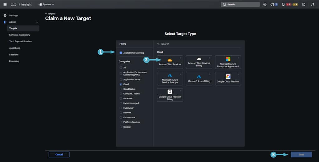🔵 Now use the steps below to select the Amazon Web Services target type.