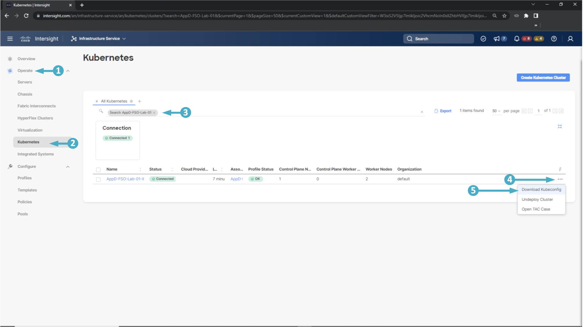 5. Select the ‘Download Kubeconfig’ drop-down option