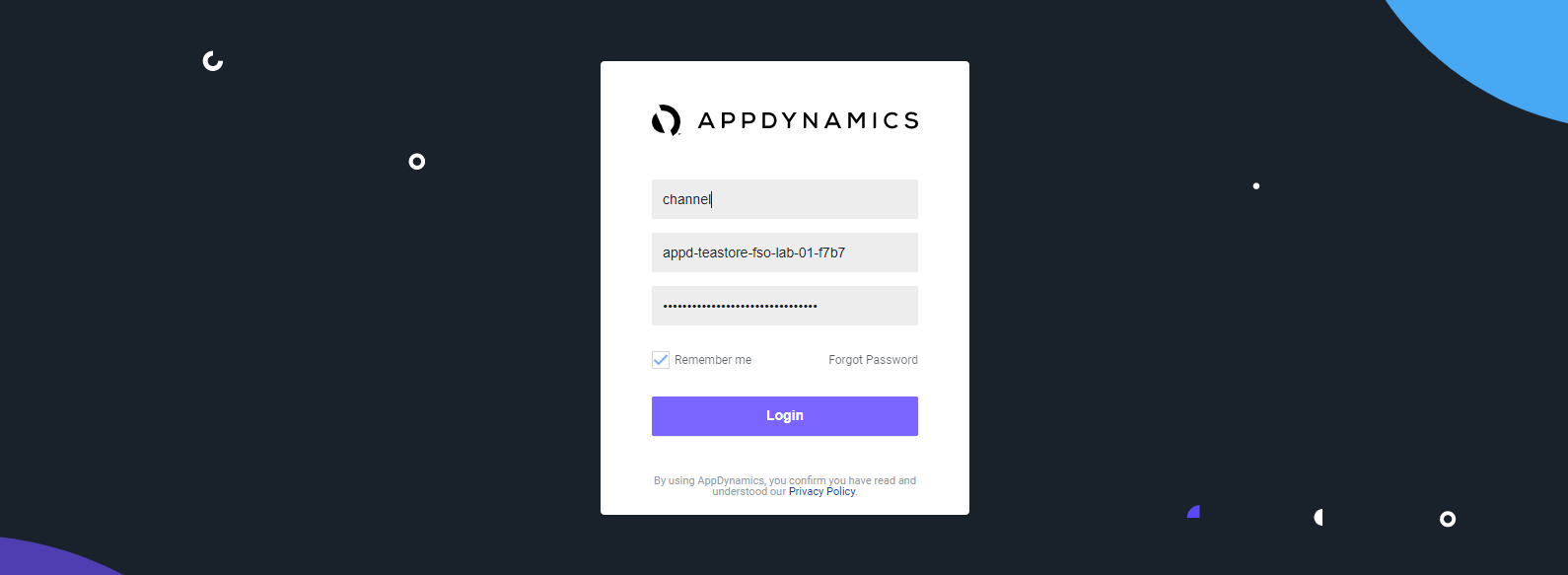 Enter the Account, Username, and Password found in the file to login to the AppDynamics controller.