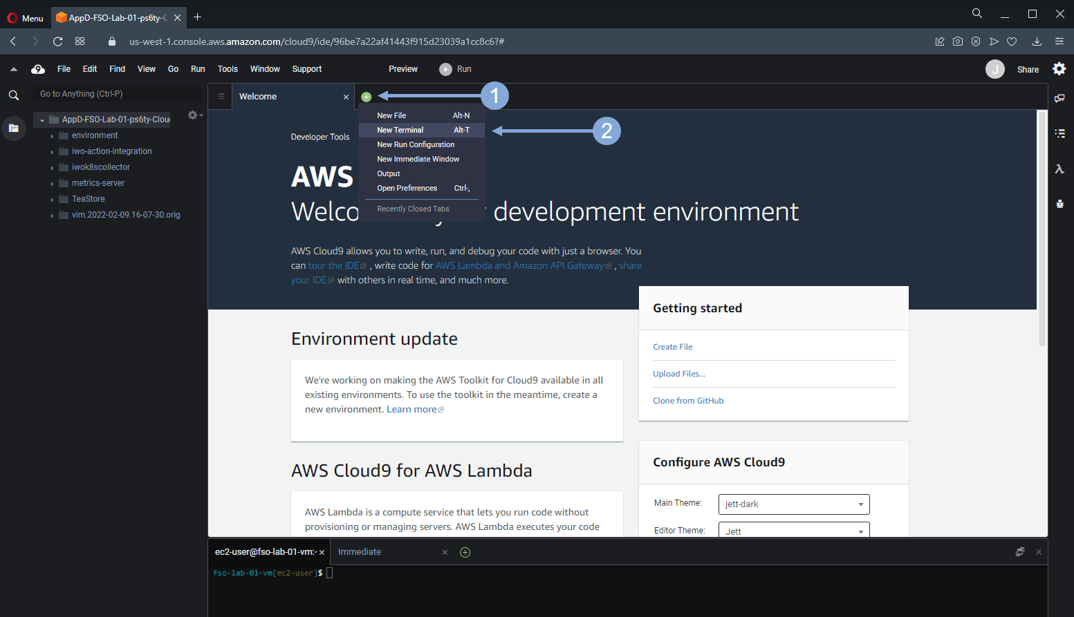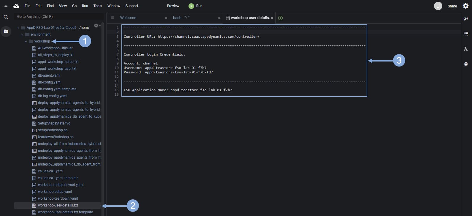 🔵 Use the steps below in your Cloud9 IDE to find your login details for the AppDynamics controller.
