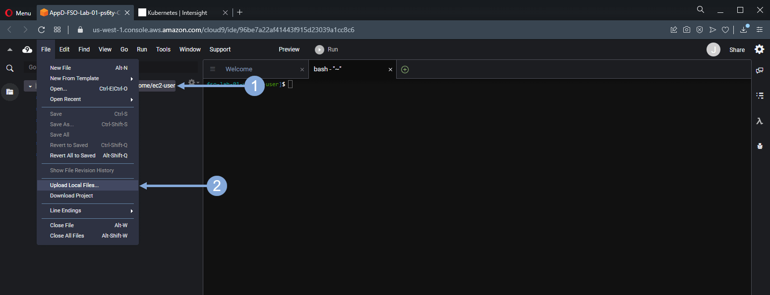 Now upload the IKS Kubeconfig file to your Cloud9 file system using the steps below.