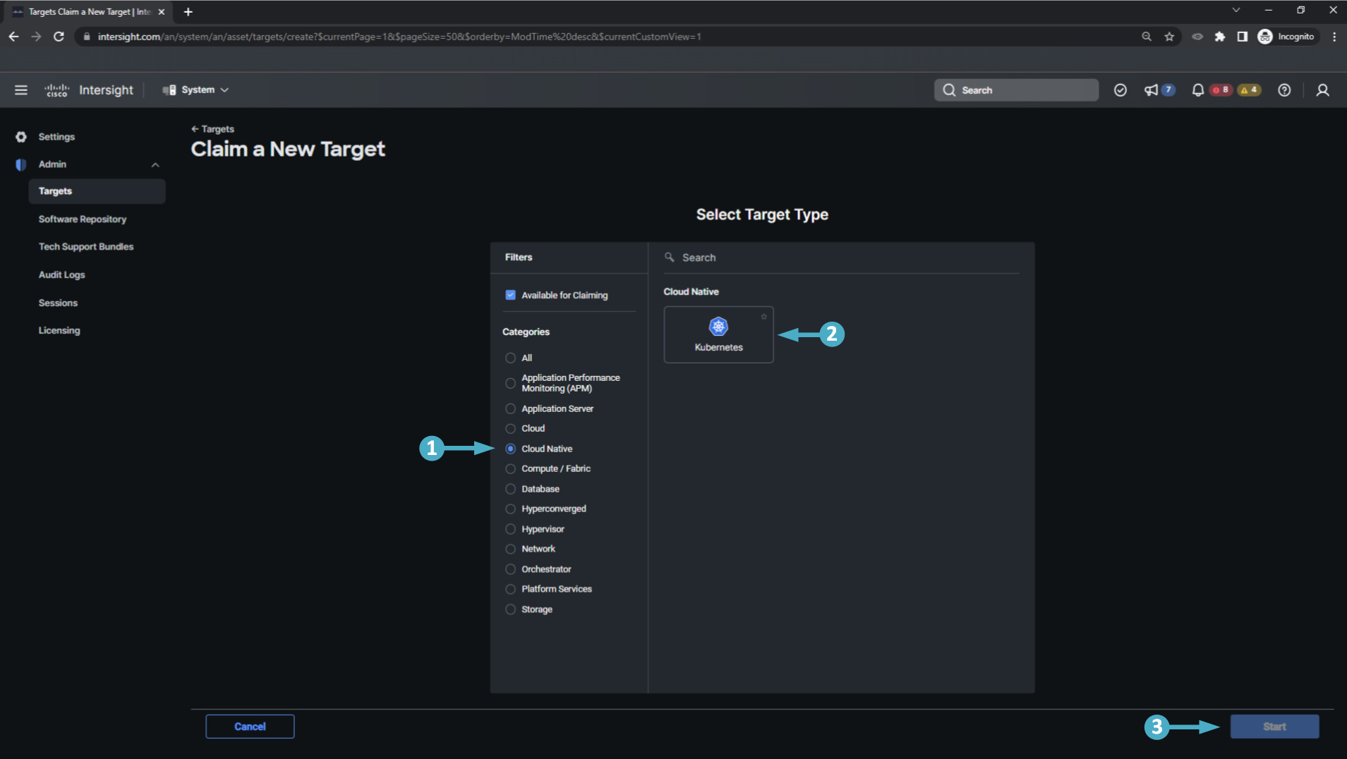 🔵 Now use the steps below to select the Kubernetes target type.