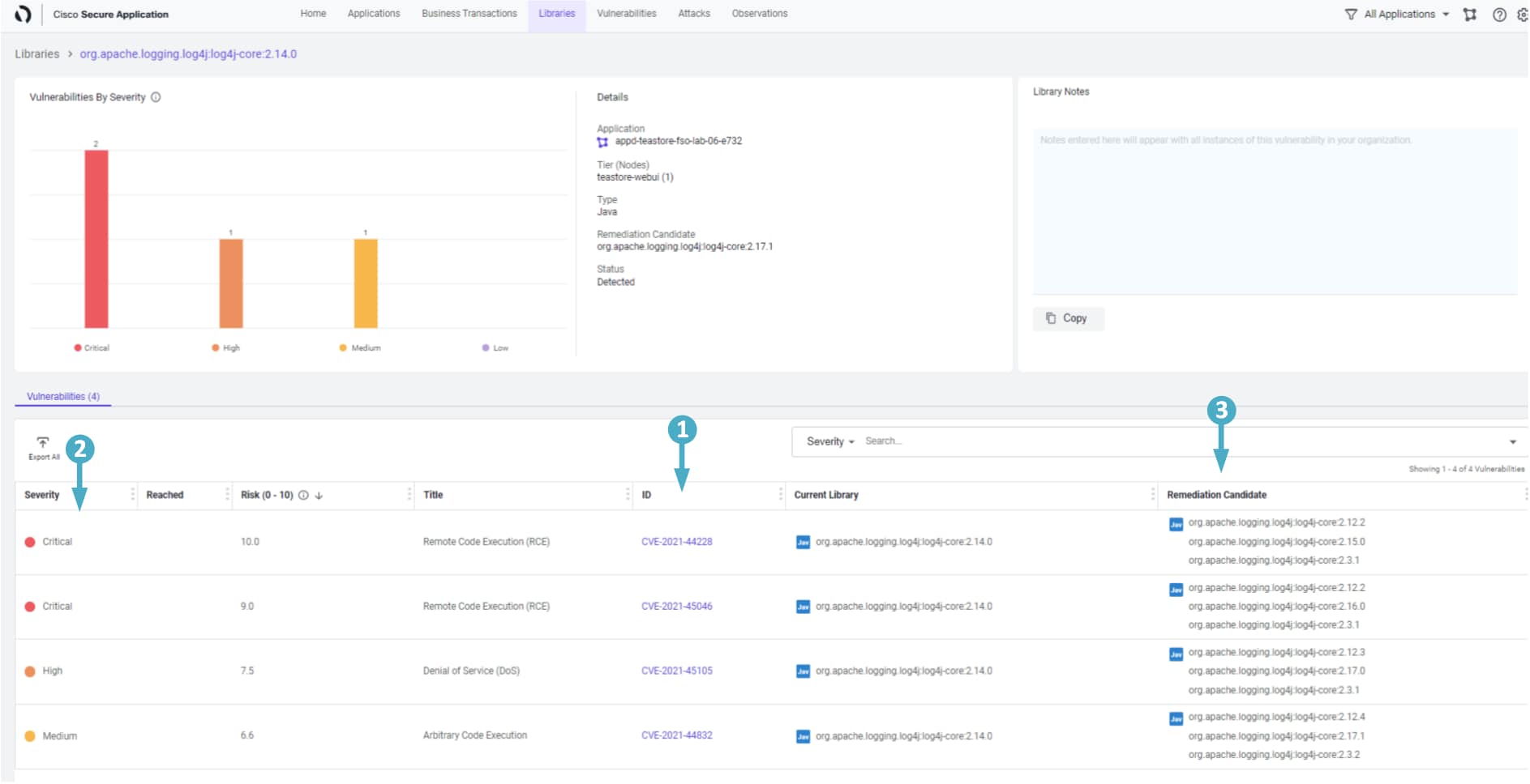 4. Secure Application also suggests the version of the library (Remediation Candidate) to remediate those vulnerabilities in the respective LibrariesRisk