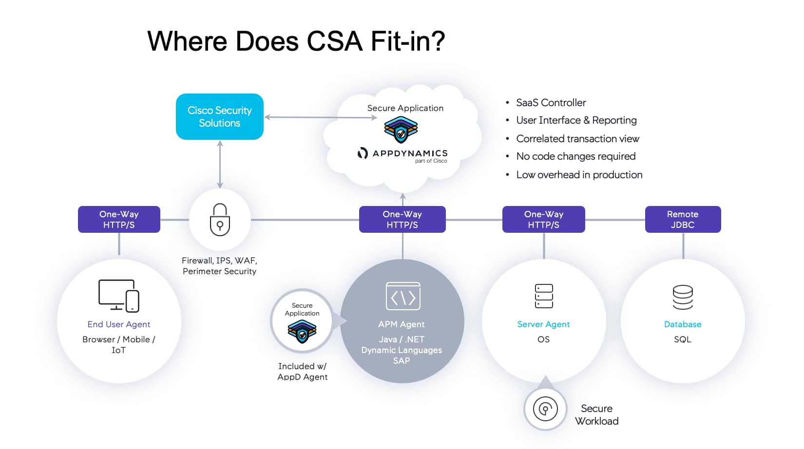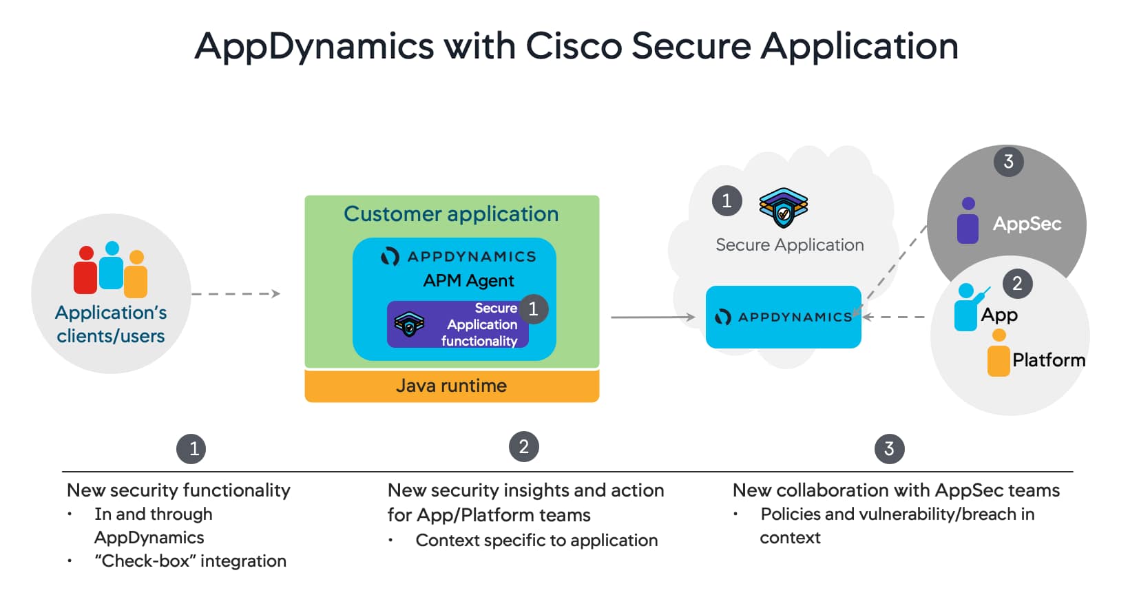 For Cisco Secure Application, there is no need to deploy any additional agent. As shown in the diagram below, the feature is embedded into existing APM agent. It has negligible overhead and doesn’t impact end-users.