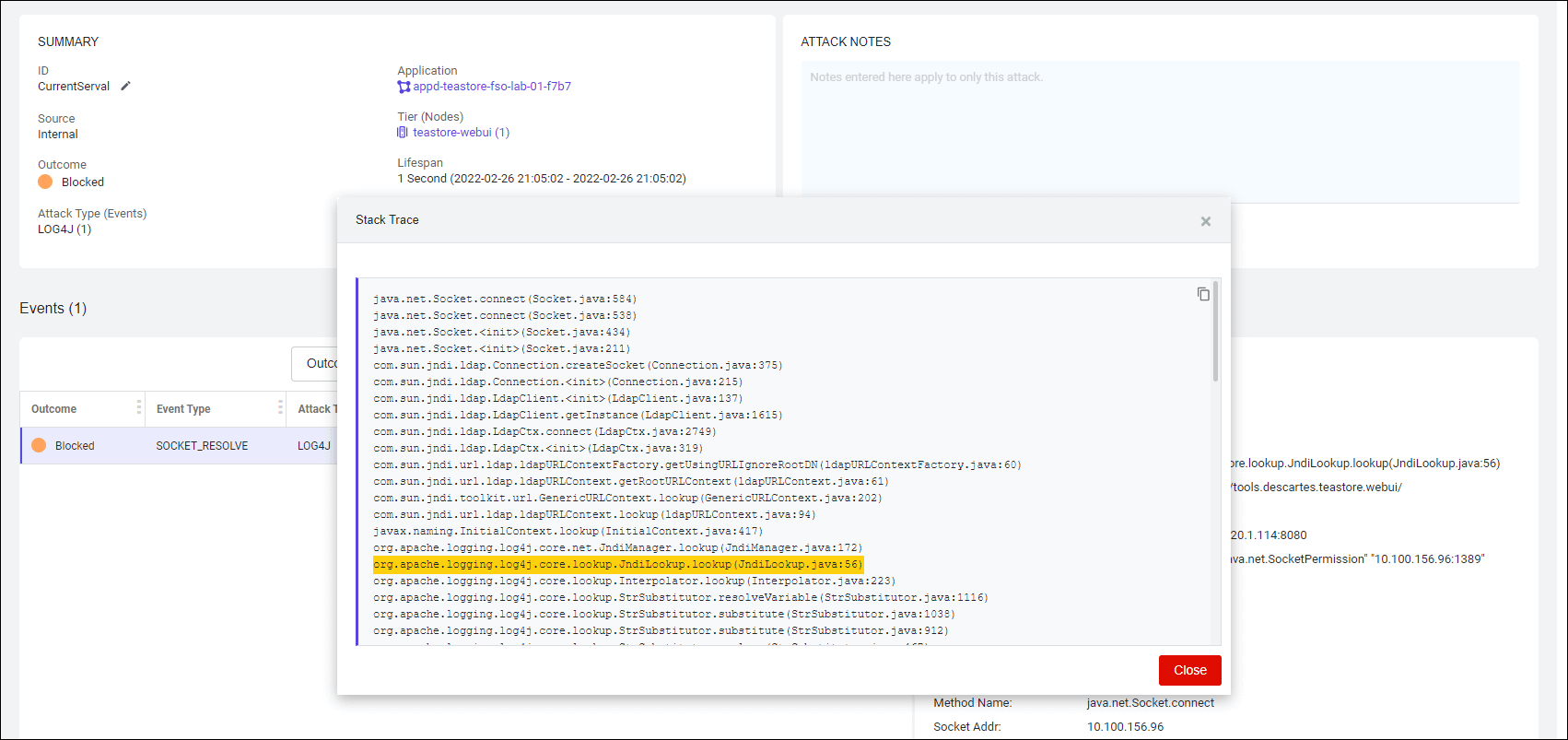 As highlighted below, it confirms a line with ā€˜org.apache.logging.log4j.core.net.JndiManager.lookup’. This information can be used to guide developers to the lines of code that was used to achieve the result of the event.