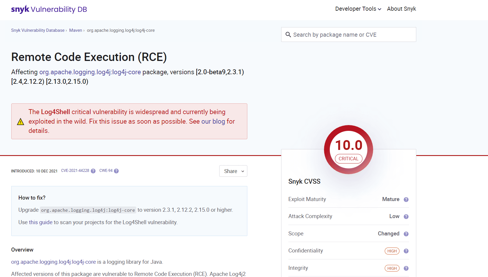 šŸ”µ Example of the synk website for ā€˜CVE-2021-44228’